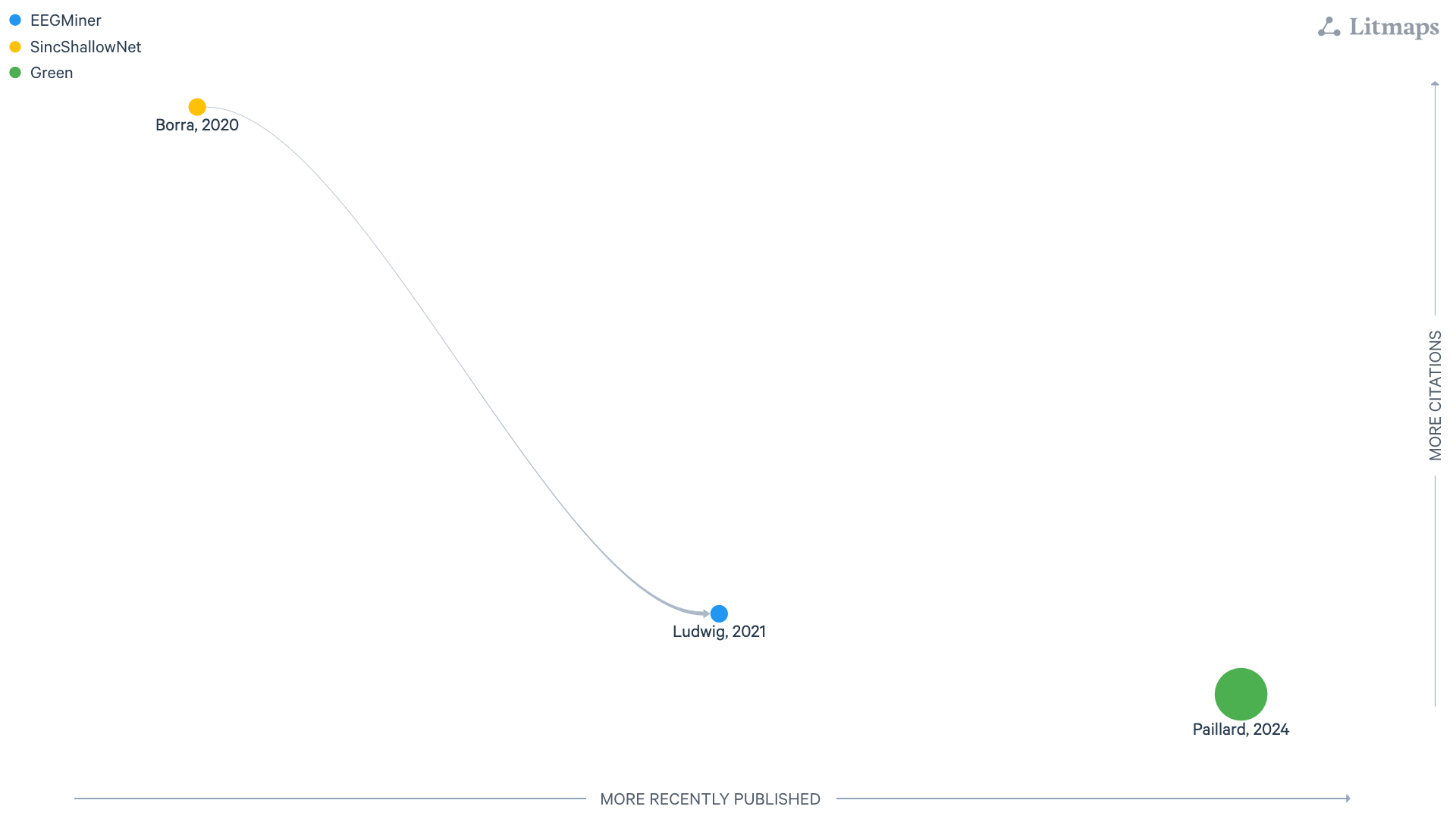 Figure: LitMap with interpretable by design layers, last updated 26/08/2025. Each node is a paper; rightward means more recently published, upward more cited, and links show amount of citation with logaritm scale.#