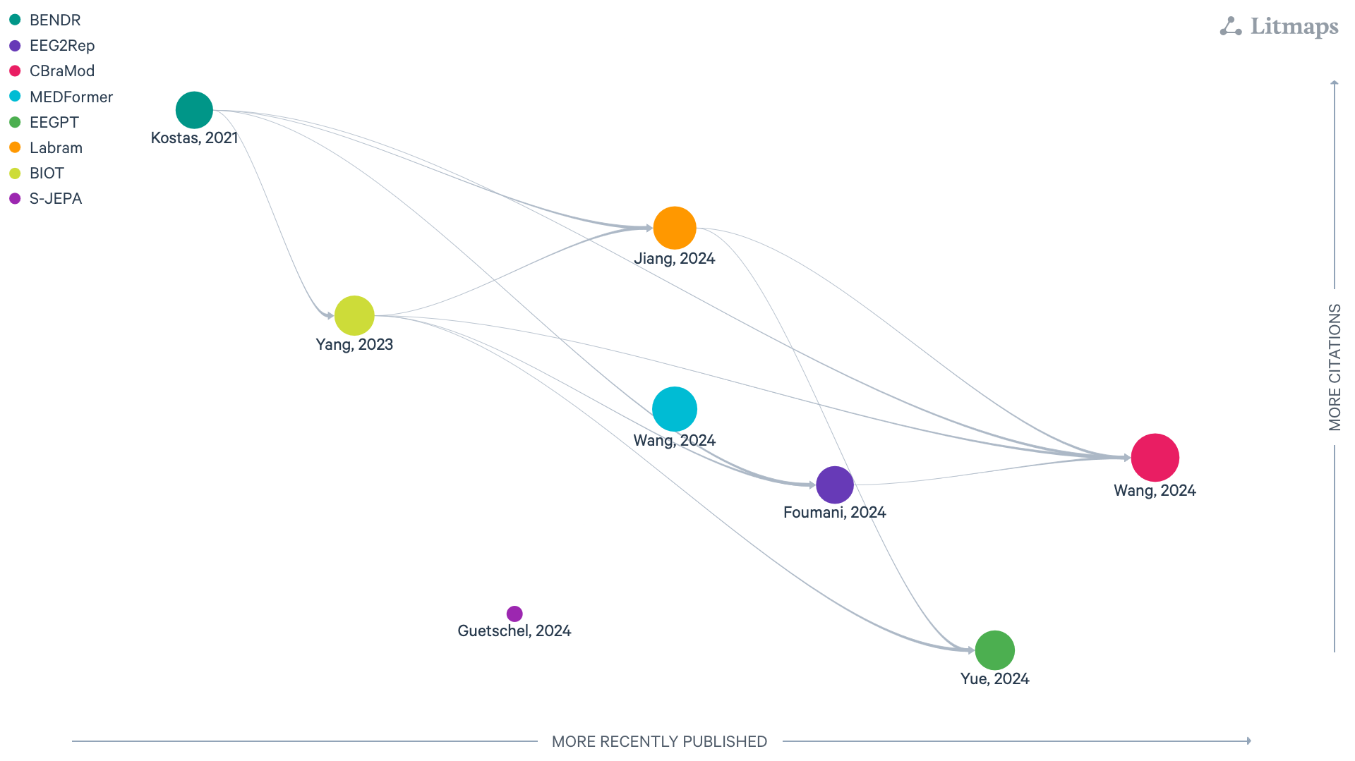 Figure: LitMap with foundation model layers, last updated 26/08/2025. Each node is a paper; rightward means more recently published, upward more cited, and links show amount of citation with logaritm scale.#