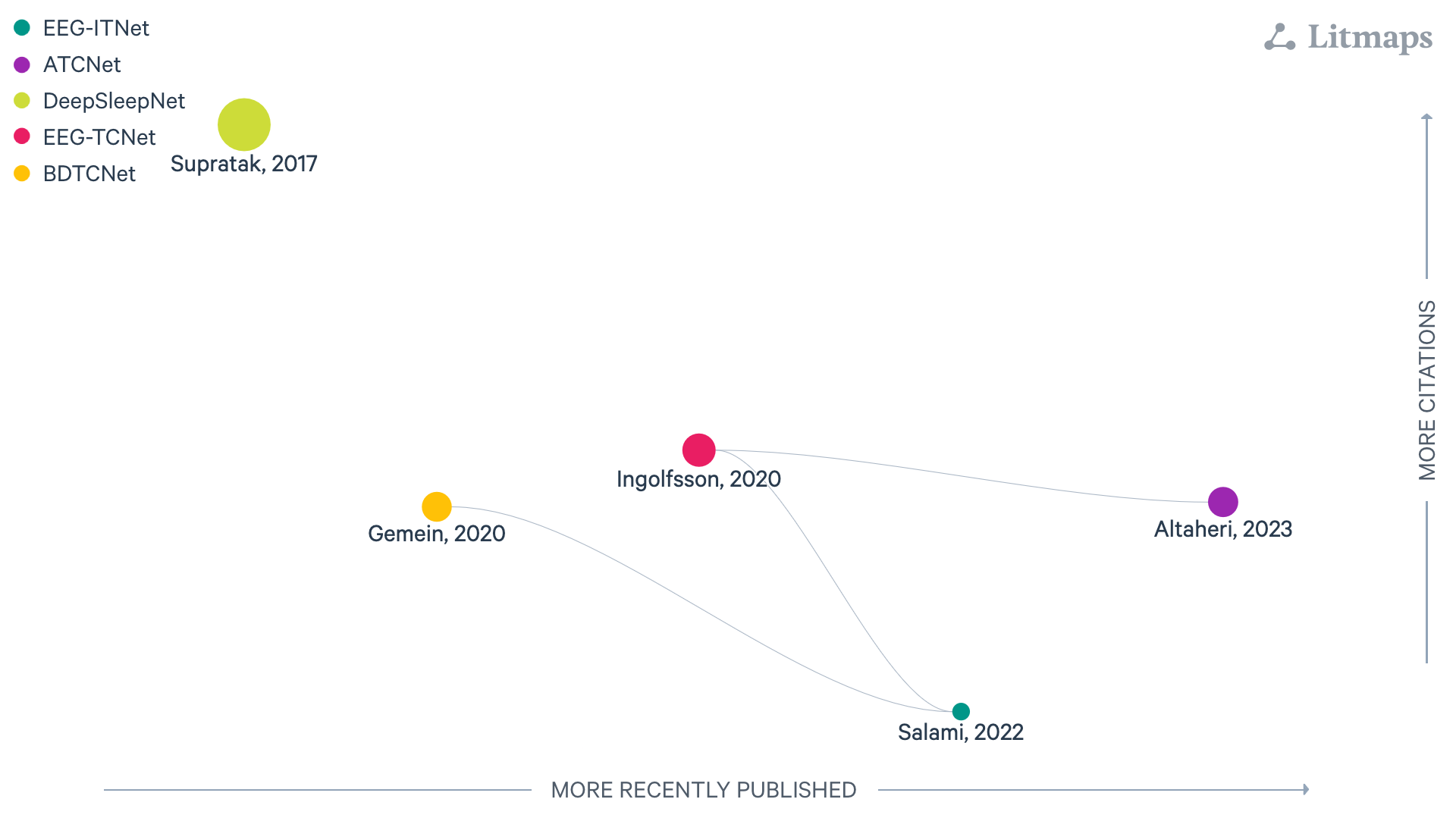 Figure: LitMap with Recurrent-layer core components for EEG architectures, last updated 26/08/2025. Each node is a paper; rightward means more recently published, upward more cited, and links show amount of citation with logaritm scale.#