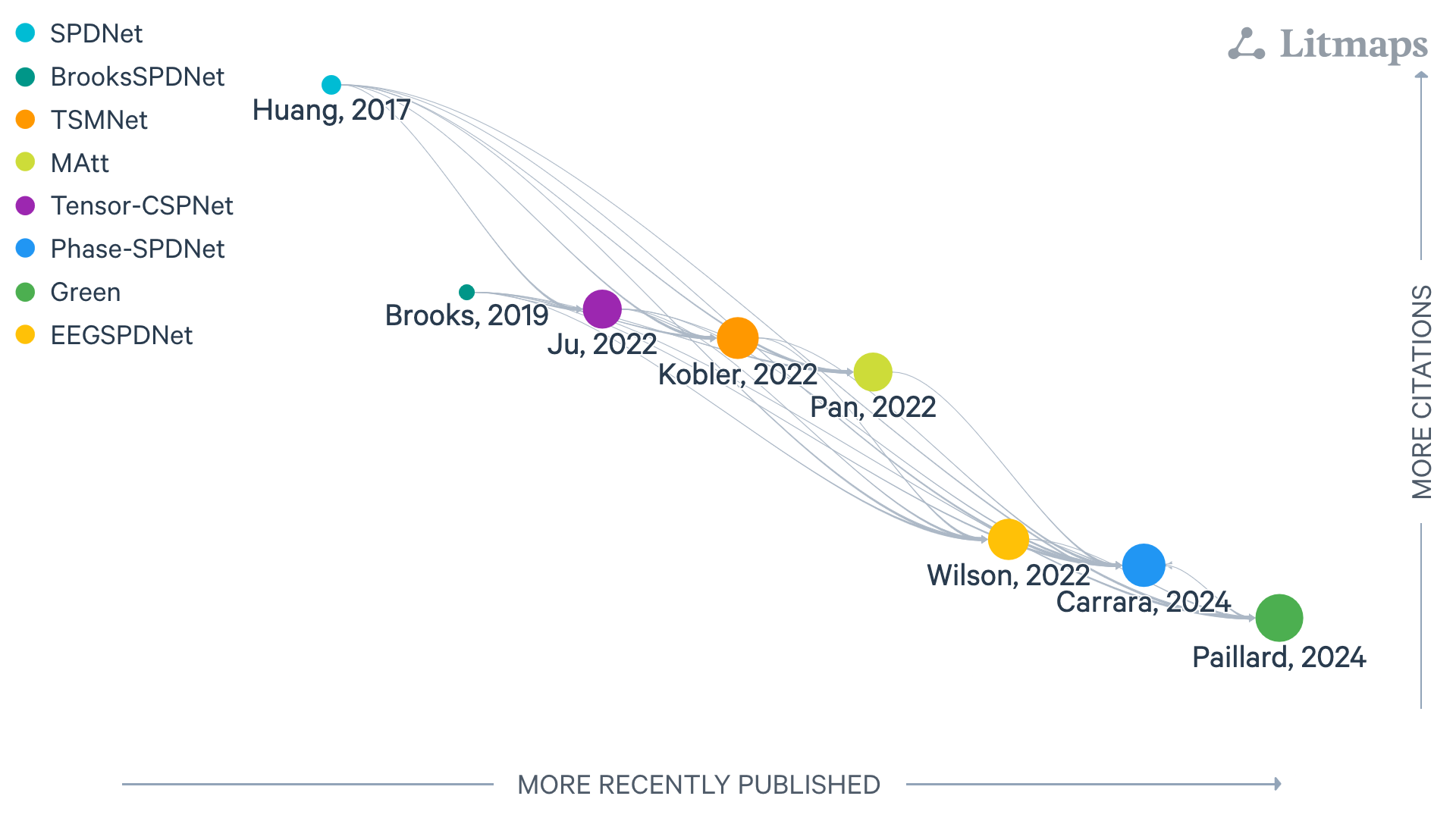 Figure: LitMap with symmetric positive-definite layers, last updated 26/08/2025. Each node is a paper; rightward means more recently published, upward more cited, and links show amount of citation with logaritm scale.#
